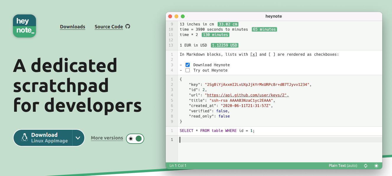 每个块都可以设置自己的语言(如 JavaScript、JSON、Markdown 等),并支持语法高亮和自动格式化。此外,HeyNote 还提供了一个计算器功能,可以用于简单的计算,并支持变量、函数和单位转换。该应用程序可在多个操作系统上下载和使用。